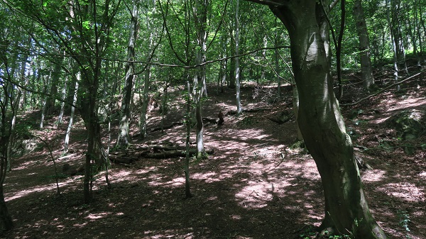 Follow the boardwalk from St Cyngar's Church - always keeping to the left path until you are deposited on the old path. When you are back on the gravel path follow it for a few hundred yards until the woodland rises more or less open (as below) on your right.